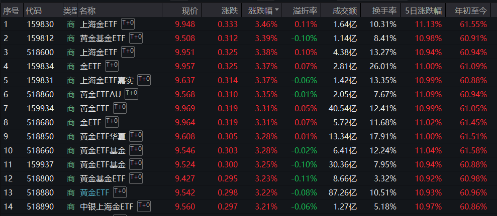 10月17日上午,黄金类ETF依然位居涨幅榜前列,黄金类ETF、上海金ETF等产品年内涨幅已超60%。