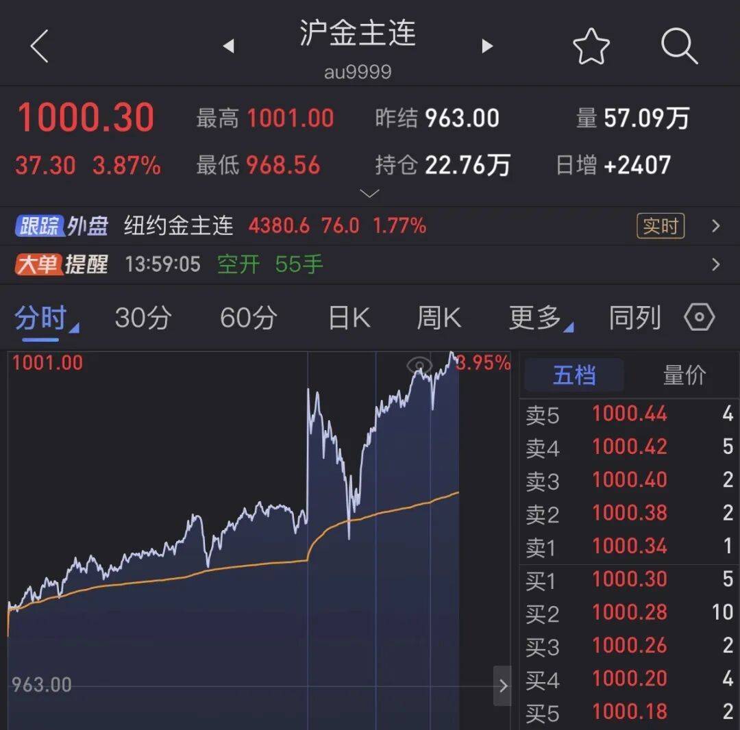 刚刚,沪金主力合约站上1000元整数关口,日内涨近4%,续创历史新高。