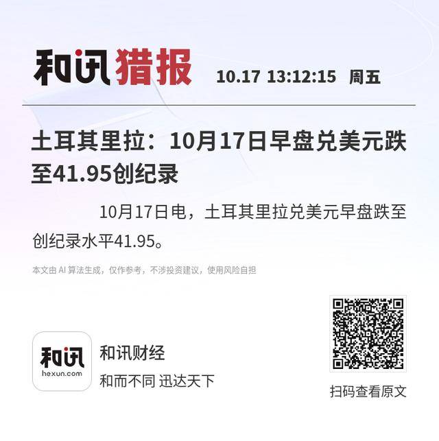 10月17日电,土耳其里拉兑美元早盘跌至创纪录水平41.95。