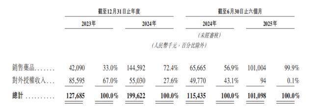 报告期内,公司收入结构出现重大变动。其中,药品销售收入占比从33.0%提升至99.9%,而对外授权收入占比从67.0%降至0.1%。