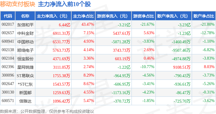 从资金流向上来看,当日移动支付板块主力资金净流出28.13亿元,游资资金净流入6.69亿元,散户资金净流入21.44亿元。移动支付板块个股资金流向见下表: