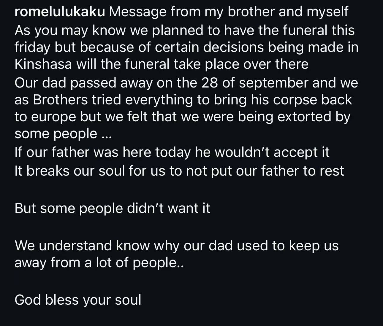 近日,卢卡库表示,他和弟弟乔丹-卢卡库遭到了一些人的勒索,这些人拒绝将他的父亲的遗体交给他们,使得他们无法在比利时为父亲举办葬礼。在父亲去世后,卢卡库兄弟原本计划在布鲁塞尔的科克尔伯格大教堂举行葬礼,但由于家族纠纷,葬礼最终改在刚果民主共和国的首都金沙萨举行。不过,卢卡库和弟弟无法到场。