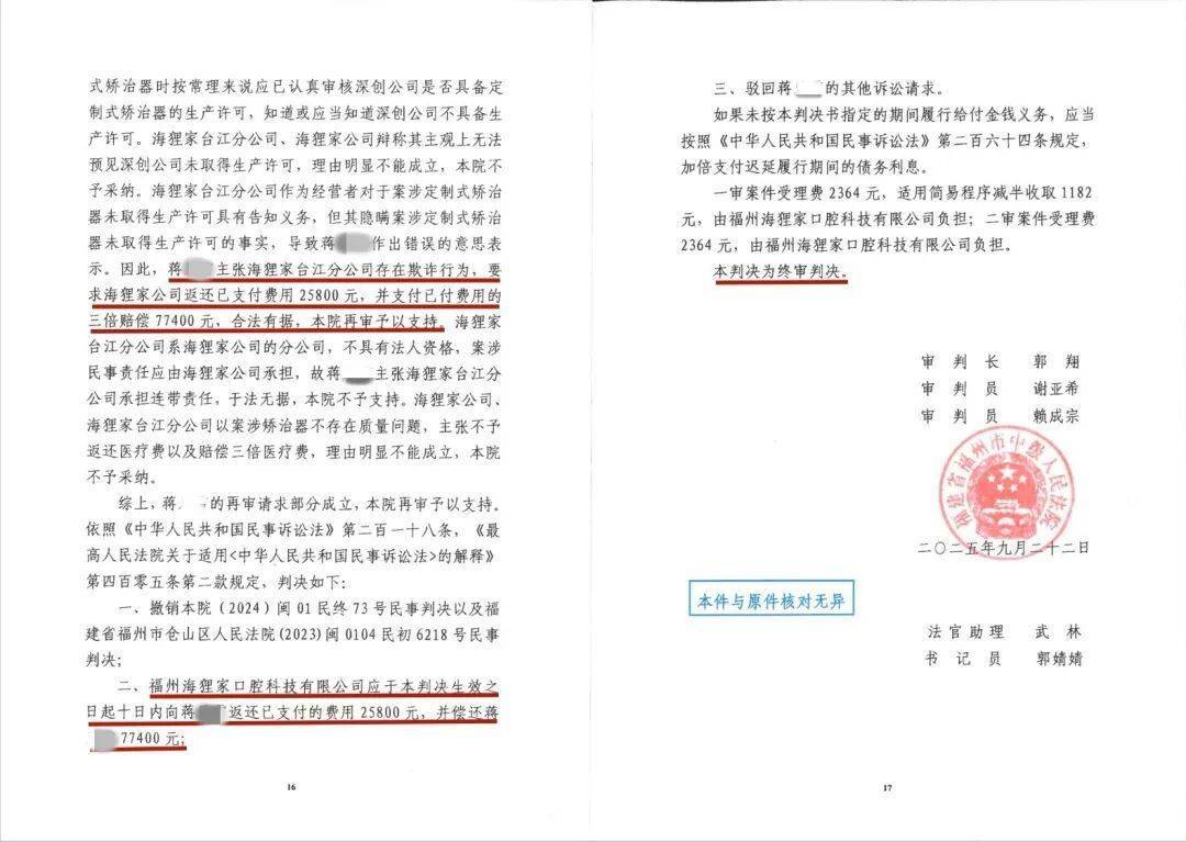 近日,在历时800余天、两次败诉后,一位誓为女儿讨回公道的“蒋爸爸”,终于在福州中级人民法院获再审胜诉判决:福州海狸家口腔科技有限公司台江分公司提供的牙齿隐形正畸服务,牙套厂家在生产制作时无相关资质,机构存在欺诈行为,需向蒋先生返还医疗费25800元并支付三倍赔偿77400元。