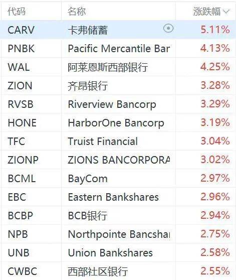 上一个交易日因信贷问题集体大跌的美股地区银行股盘中集体反弹。其中,卡弗储蓄涨超5%,Pacific Mercantile Bar、阿莱恩斯西部银行涨超4%,齐昂银行涨超3%,西部社区银行涨超2%。