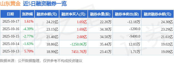 山东黄金融资融券信息显示,融资方面,当日融资买入4.57亿元,融资偿还3.51亿元,融资净买入1.05亿元,净买入额两市排名第7,连续3日净买入累计5.35亿元。融券方面,融券卖出2.6万股,融券偿还14.78万股,融券余量22.2万股,融券余额899.21万元。融资融券余额24.3亿元。