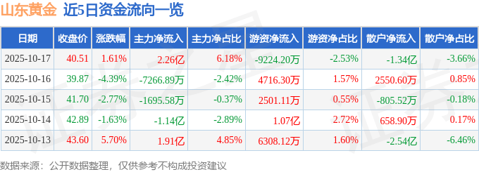 证券之星消息,截至2025年10月17日收盘,山东黄金(600547)报收于40.51元,上涨1.61%,换手率2.47%,成交量89.28万手,成交额36.53亿元。