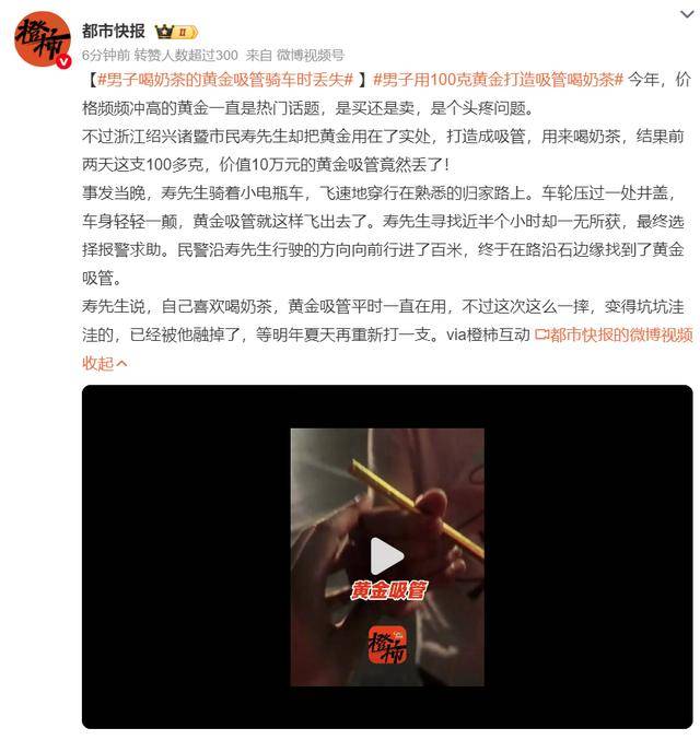 不过浙江绍兴诸暨市民寿先生却把黄金用在了实处,打造成吸管,用来喝奶茶,结果前两天这支100多克,价值10万元的黄金吸管竟然丢了!