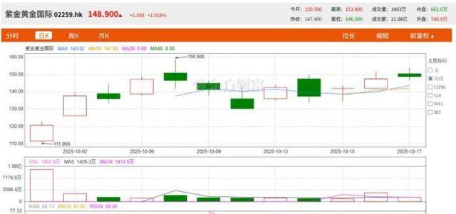 本次上市,紫金黄金国际以每股71.59港元的发行价成功募资近250亿港元,市值突破3100亿港元,成为今年港股市场第二大IPO,仅次于宁德时代。上市后的股价表现亮眼,最高曾触及158港元,较发行价翻番。然而,随着市场波动,截至10月17日收盘,股价回落至147.2港元,较高点下跌约6.84%,总市值仍为3955亿港元。