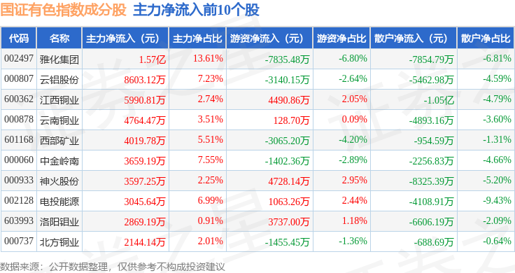 资金流向方面,国证有色(399395)指数成份股当日主力资金净流出合计41.18亿元,游资资金净流入合计4.59亿元,散户资金净流入合计36.59亿元。成份股资金流向详情见下表:
