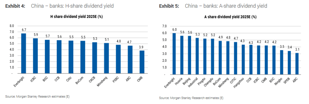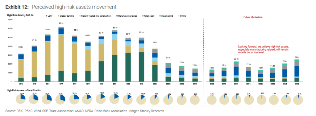 - 高风险资产持续消化: 通过市场化的方式控制对产能过剩行业的资金流入,高风险资产规模正在平稳下降。大摩预测,高风险资产占总信贷的比例将从2024年的9.2%在未来几年内下降至3%左右的低位。这将显著降低中国金融股的风险溢价。