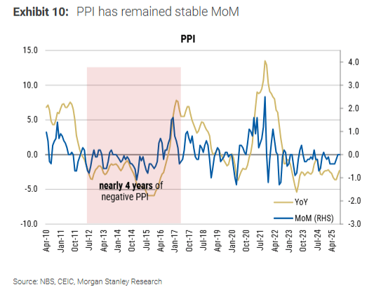 - 供给侧结构优化见效: 在“反内卷”政策引导下,制造业资本支出增长放缓(从7月的6.2%降至9月的4.0%),信贷流向更为理性。这有效缓解了部分行业的产能过剩问题,制造业固定资产投资和工业增加值之间的差距在9月份已经闭合。其结果是,尽管短期宏观增长放缓,但工业企业利润正在逐步改善,PPI同比降幅也在持续收窄。