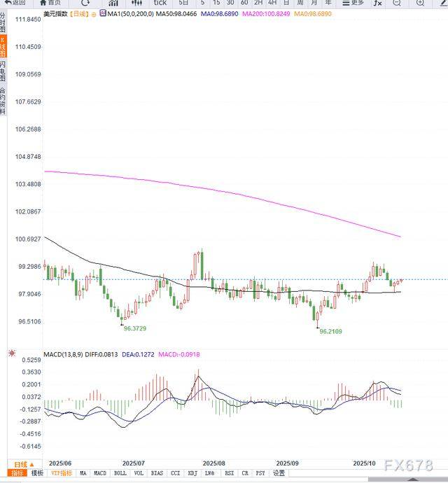 若指数跌破 98.30 支撑,可能延伸至 98.00–97.80 区域;反之,若站稳 98.80–99.00 阻力,短线或出现反弹修正。整体日线形态显示短期空头占优,但有反弹机会,震荡偏弱格局明显。