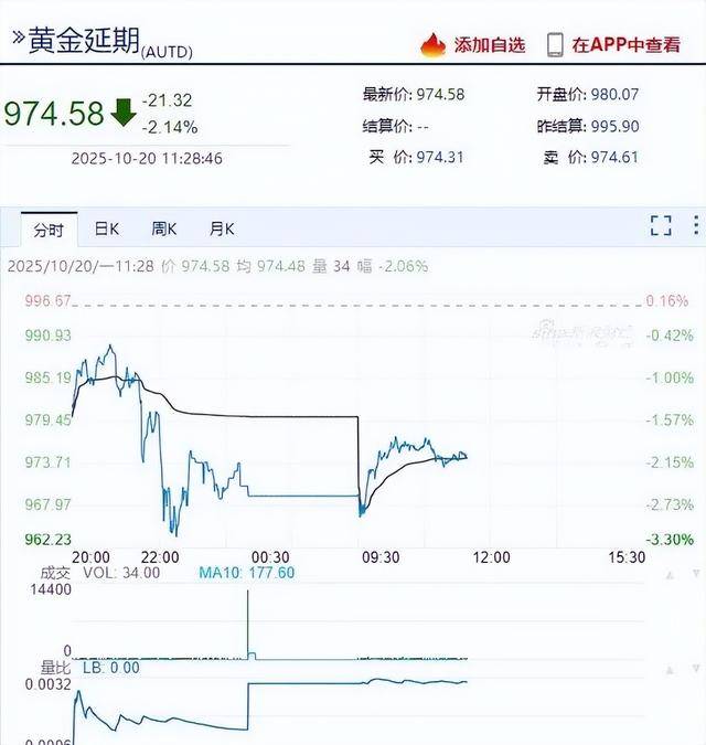 上海黄金交易所报价974.58元/克,跌2.14%。