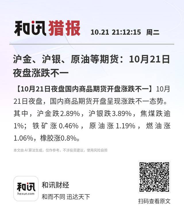 【10月21日夜盘国内商品期货开盘涨跌不一】10月21日夜盘,国内商品期货开盘呈现涨跌不一态势。其中,沪金跌2.89%,沪银跌3.89%,焦煤跌逾1%;铁矿涨0.46%,原油涨1.19%,燃油涨1.06%,橡胶涨0.8%。