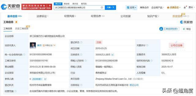 天眼查App显示,近日,浙江阿里巴巴小额贷款股份有限公司登记状态由存续变更为注销。