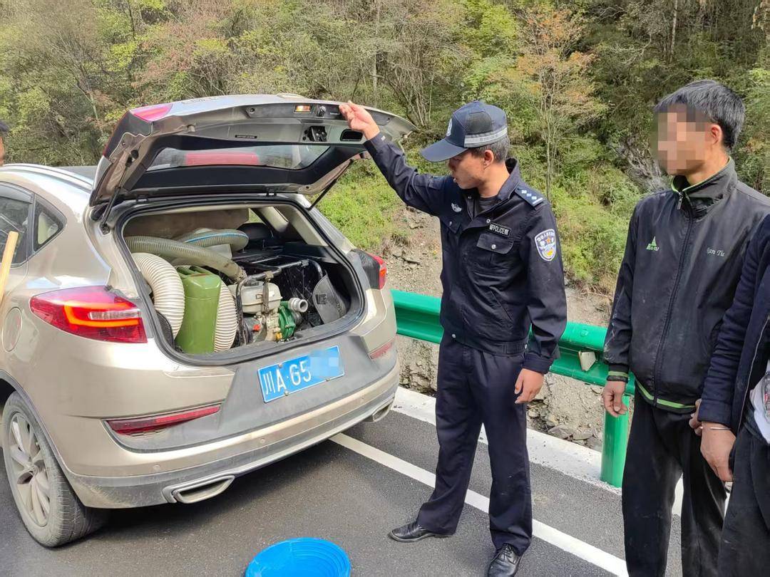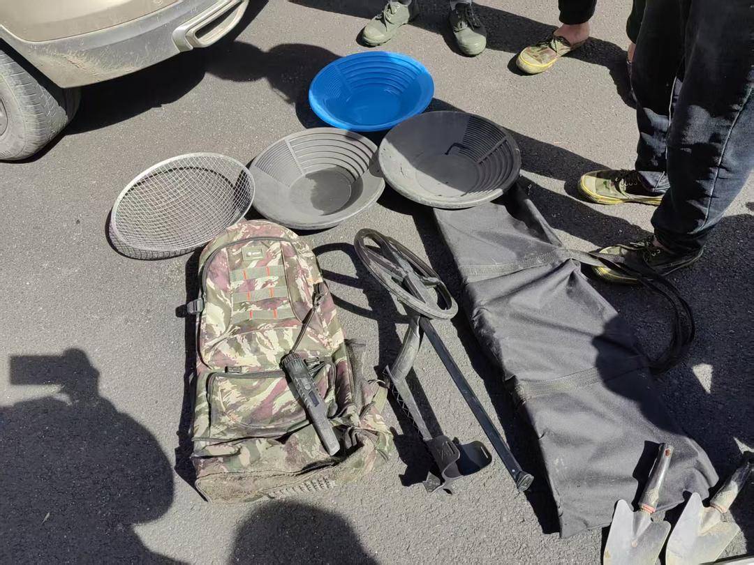 民警介绍,办案人员在三人驾驶的川A拍照小型越野车上,查获抽水机、淘金盆、金属探测仪等一批专业采金设备。