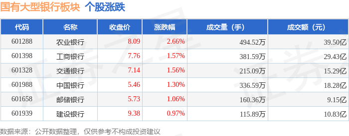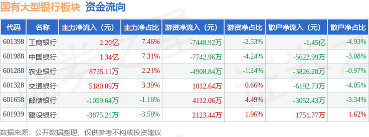 从资金流向上来看,当日国有大型银行板块主力资金净流入4.43亿元,游资资金净流出1.29亿元,散户资金净流出3.15亿元。国有大型银行板块个股资金流向见下表: