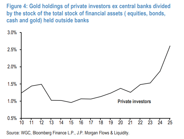 策略师Nikolaos Panigirtzoglou领导的团队指出,如果全球非银行私人投资者将其金融资产中黄金的配置比例从目前的2.6%提升至4.6%,那么到2028年,金价可能需要从当前水平上涨110%才能满足这一需求。