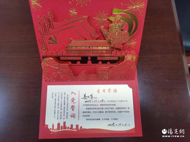 这份鲜红的政治生日贺卡镌印着党旗、党徽和入党誓词,是关怀、也是提醒,是荣誉,更是责任,要求党员同志发挥先锋模范作用,不忘初心、牢记使命,不自满、不懈怠,在建设“四心银行”、服务区域经济发展的新征程上克难奋进、砥砺前行。(赖家斌)