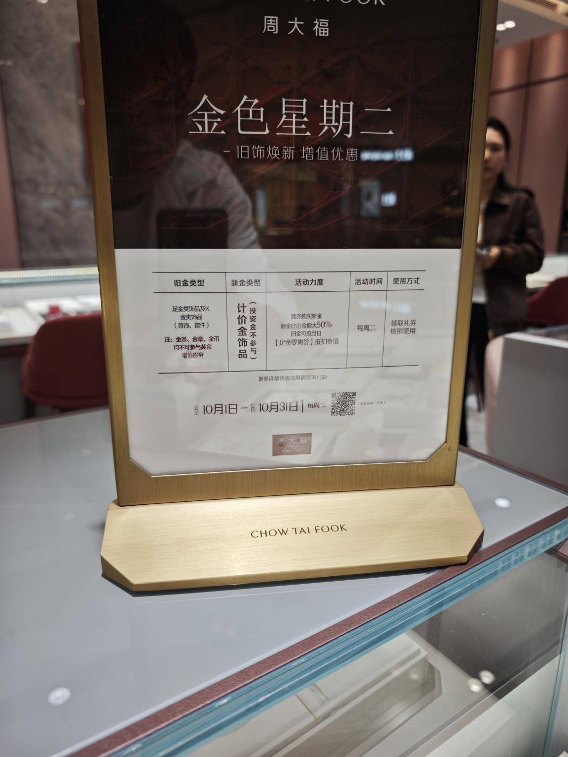 比如,若顾客持有5克周大福旧金,则必须置换至少7.5克的新金饰。假设当日足金零售价为1260元/克,旧金抵扣价值为6300元(5克×1260元/克)。若所选新金饰总价为10,000元(含金价与工费),则抵扣后需补足3700元的差价。该活动在10月期间的每周二开展。