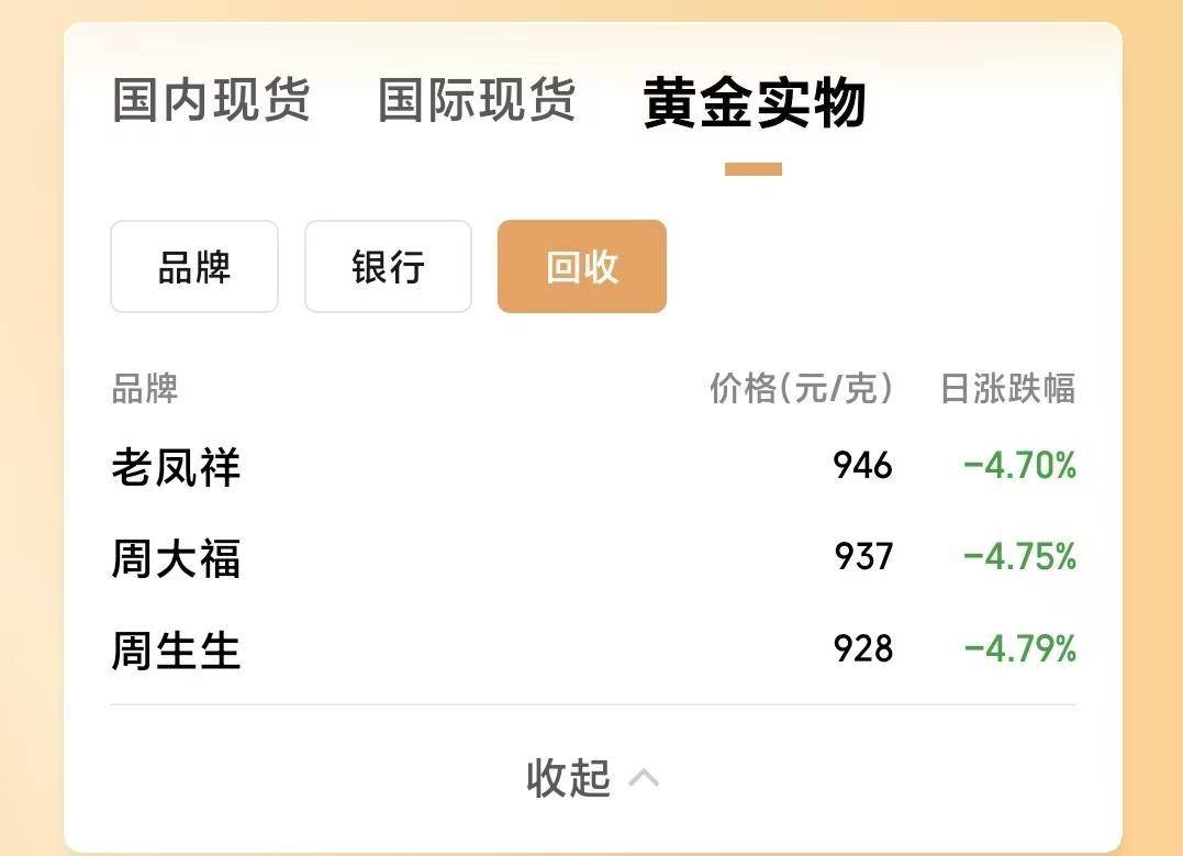 记者查询公开信息了解到,10月22日,周大福的回购价为937元/克,若旧黄金非周大福品牌金饰还需扣除2%的损耗费。周生生当天黄金回收价则为928元/克。而在武汉光谷步行街附近的多家个体金店,记者了解到,黄金回收价格普遍在925元/克上下浮动,与当日部分品牌金店的回收价格相差不大。