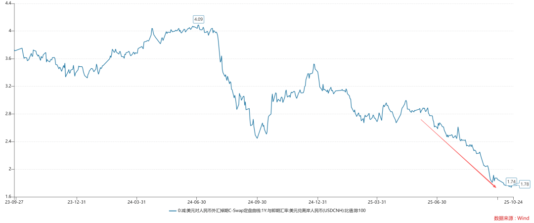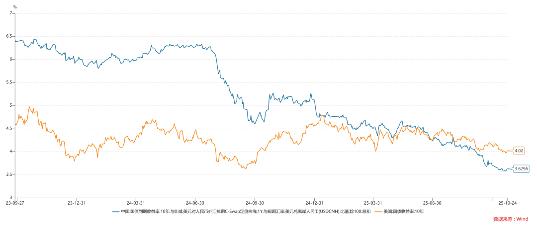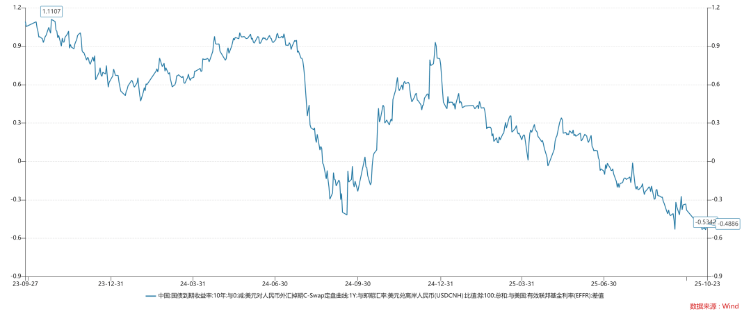 如上图所示,十年美债利率在4.02%,美元计价的十年中债利率在3.63%,二者相差了40bp。这意味着,无风险利率的归属短暂地发生了转移,从美国转移到中国。