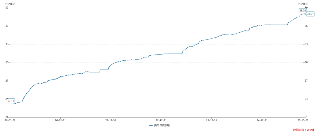 为什么要采用这个视角呢??如上图所示,目前,美国的国债总额已经上升至38万亿美金。为了缓解债务压力,美国政府很希望降低新债的发行利率。但是,降低联邦基金利率只能降低短债的发行利率,未必会降低长债的发行利率,甚至会适得其反,导致长债发行利率飙升。