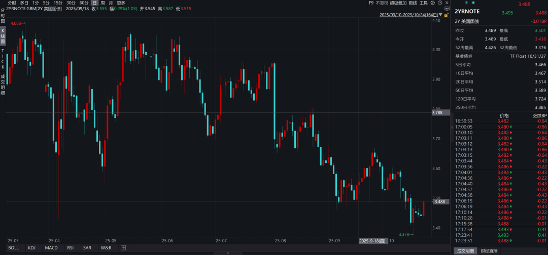 与此同时,两年美债利率保持在3.49%左右,跟点阵图所隐含的基准利率基本保持一致。