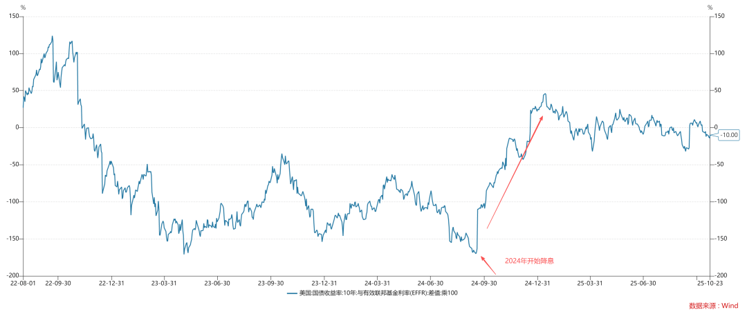 但是,美联储降息100bp之后,十年美债利率开始高于联邦基金利率。这意味着,传导效率大幅下降。于是,美联储开始暂停降息。直到今年9月份,美联储才重新开始降息,并且是那种小心翼翼地“挤牙膏式”地降息。