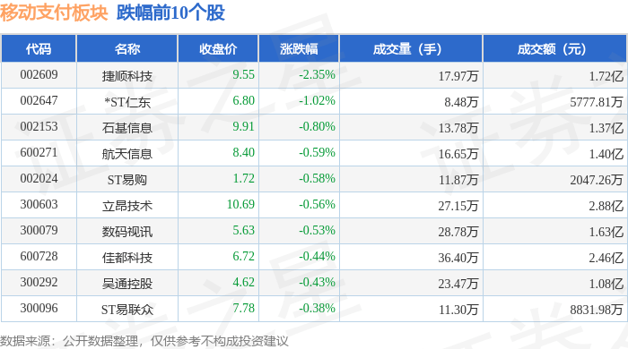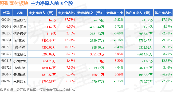 从资金流向上来看,当日移动支付板块主力资金净流出3861.37万元,游资资金净流出9402.09万元,散户资金净流入1.33亿元。移动支付板块个股资金流向见下表:
