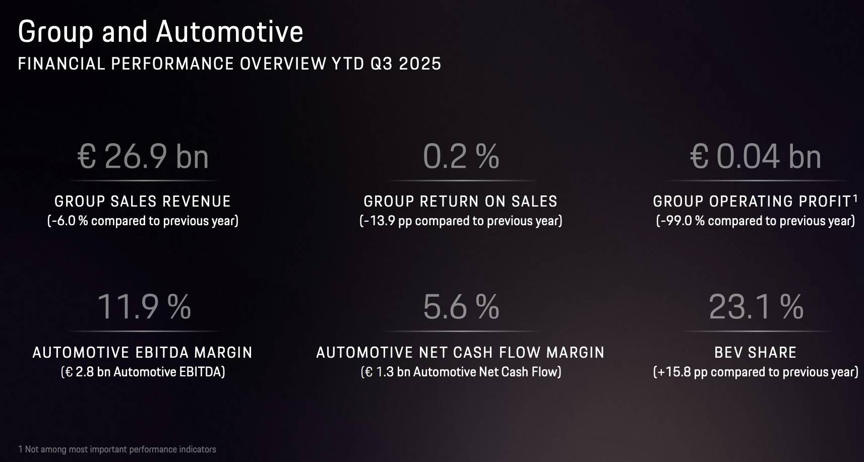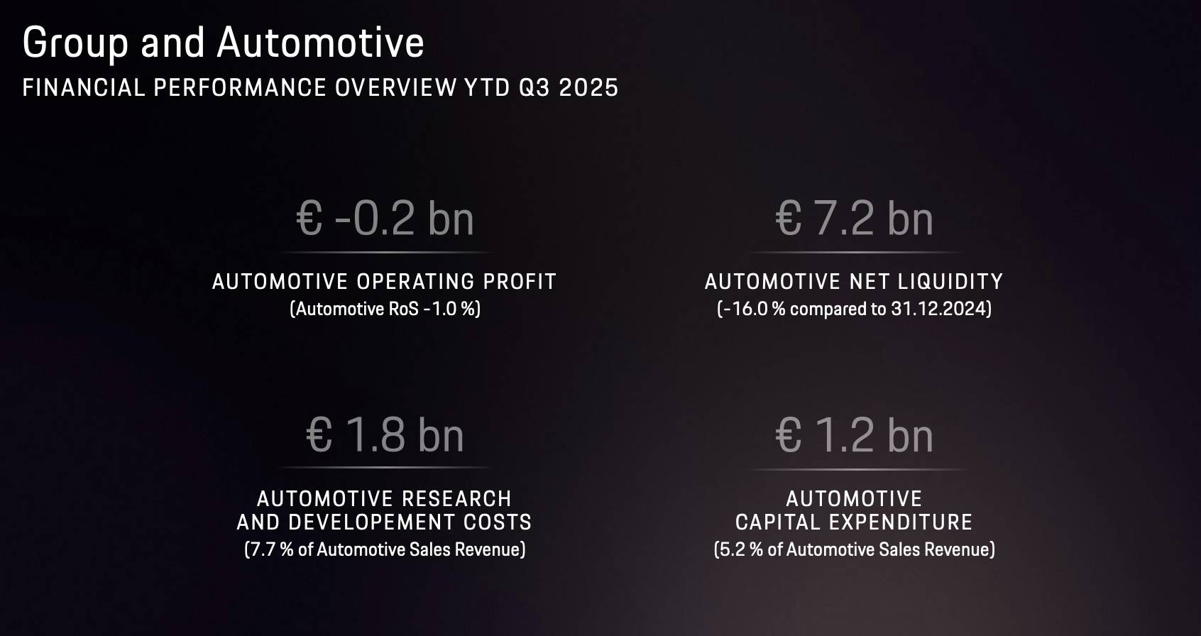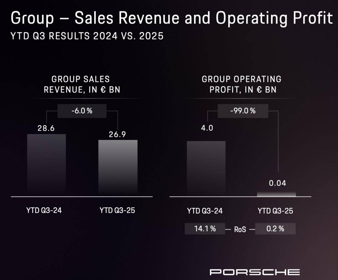 保时捷遭遇自上市以来的首次季度亏损。第三季度,其营业利润为4000万欧元,相比去年同期的40亿欧元,少了100倍。其税后利润同比跌幅为96%。