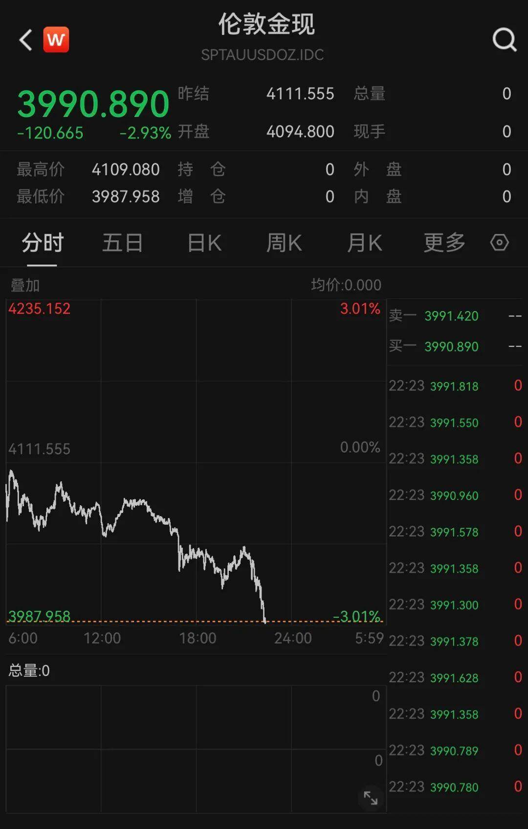 北京时间10月27日晚间,伦敦现货黄金盘中跌破4000美元/盎司,截至发稿,最低触及3987美元/盎司,日内跌幅扩大至2.8%。现货白银跌超4%,报46.5美元/盎司。