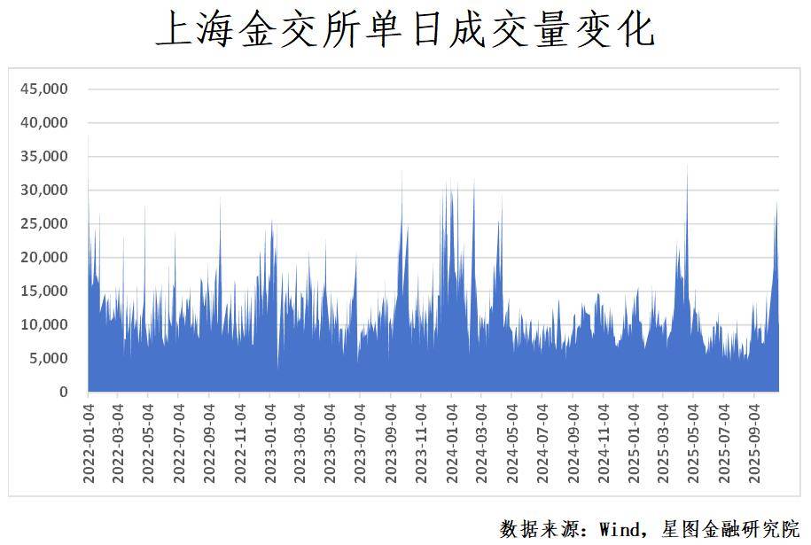 本轮行情中,10月9日,上海金交所成交量达到15595.42千克,已突破年内震荡区间高点。随后在10月14日,成交量进一步放大至26900.24千克,成为年内第三高,仅次于4月17日与4月22日。至10月20日,成交量继续攀升至27783.25千克,取代4月17日成为年内次高。这两轮行情均表现为成交量在持续放大后创出阶段性高点,随后黄金价格出现拐头向下,且转折点均对应成交量峰值。