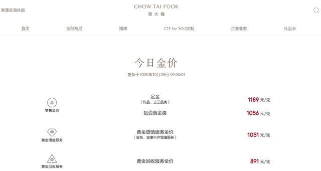 查询发现,老庙黄金报价1192元/克,较前一日下跌28元/克;周生生报价1199元/克,较前一日下跌24元/克;周大福报价1198元,单日下跌25元;老凤祥报价1202元/克,单日下跌18元/克。