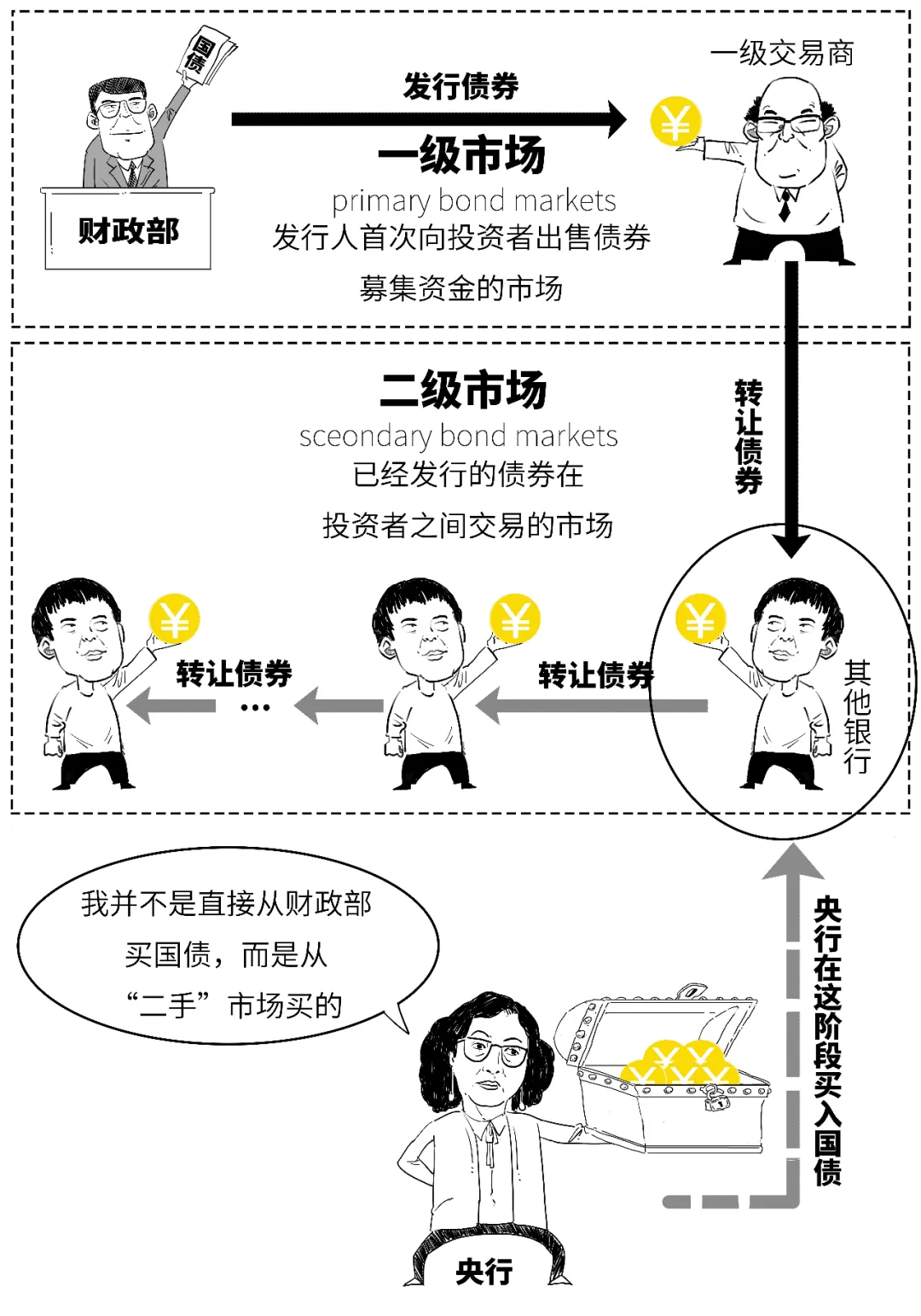 所以,央行要想买国债,只能从其他银行手中,也就是二级市场买存量的国债,而不是财政部新增的国债。