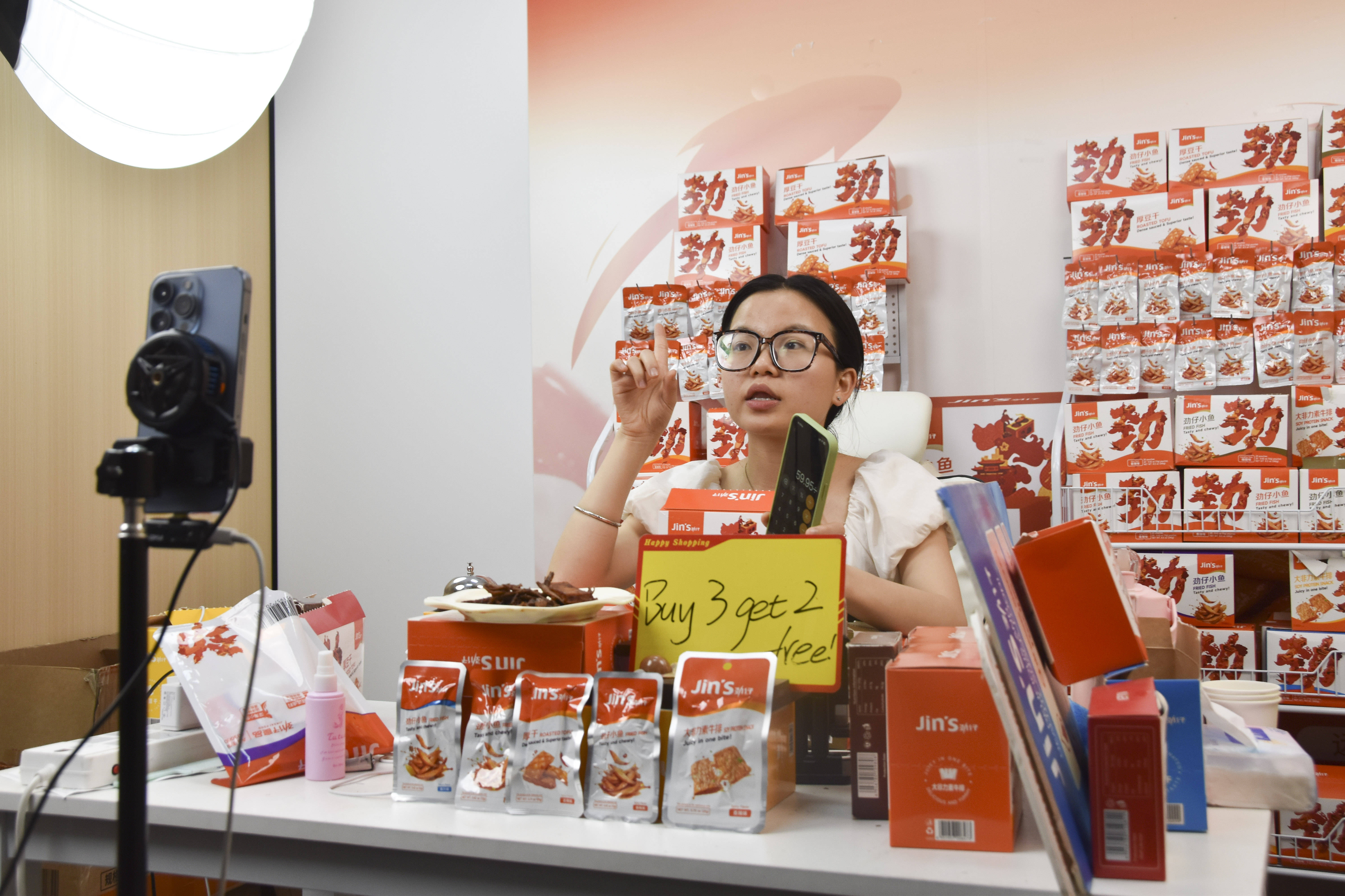 2025年4月25日,湖南长沙雨花区一家跨境电商公司的主播在海外社交平台上推销湖南特色商品。新华社记者白田田 摄