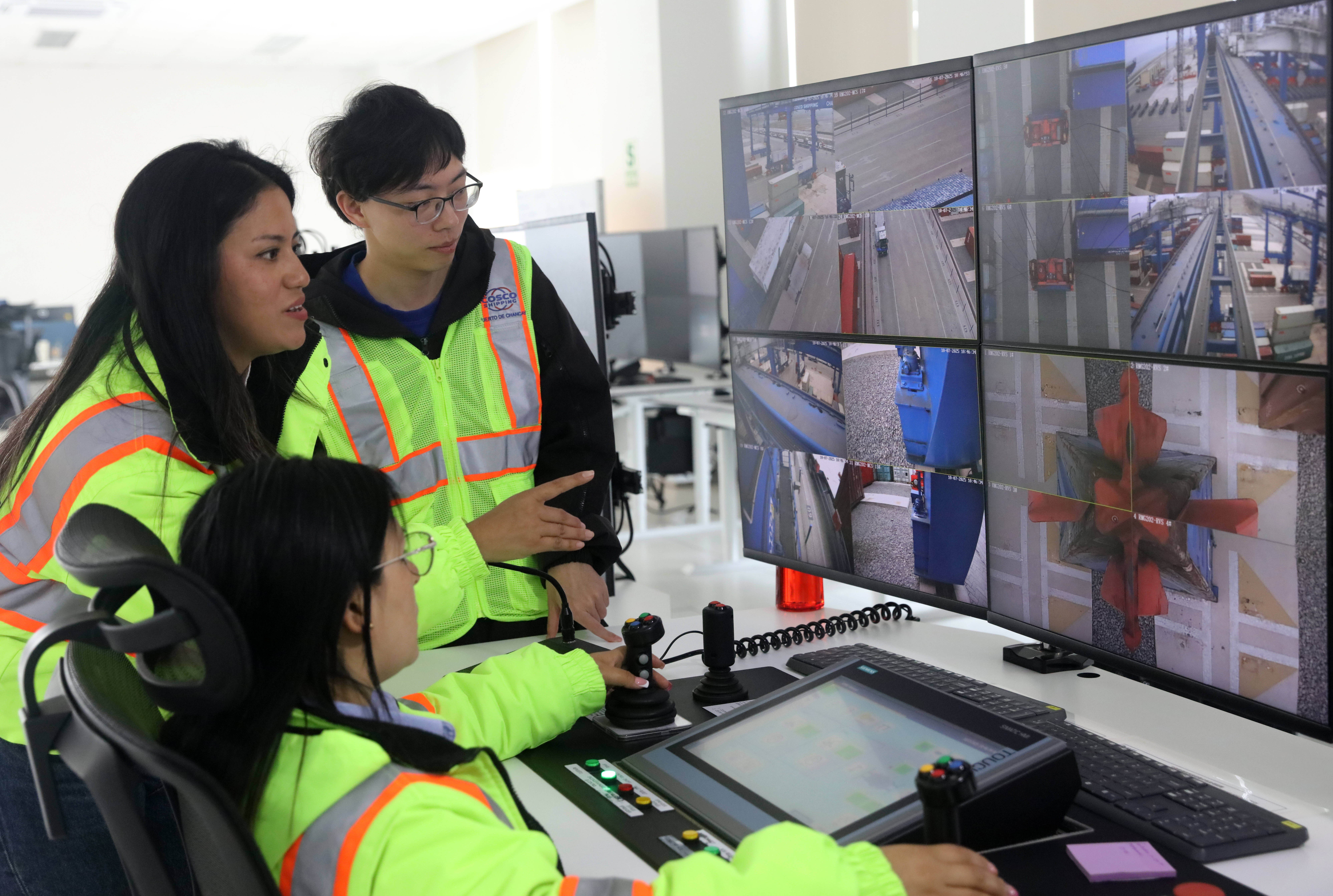 2025年10月7日,在秘鲁钱凯港,中远海运港口秘鲁钱凯公司员工阿斯特丽德·洛萨诺(左一)与同事进行作业监控。新华社发(玛丽安娜·巴索摄)