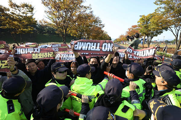英国路透社29日报道称,与韩国官方欢迎仪式形成鲜明对比的是,数百名抗议民众聚集在APEC峰会会场附近举行反特朗普集会,并与警方发生冲突。