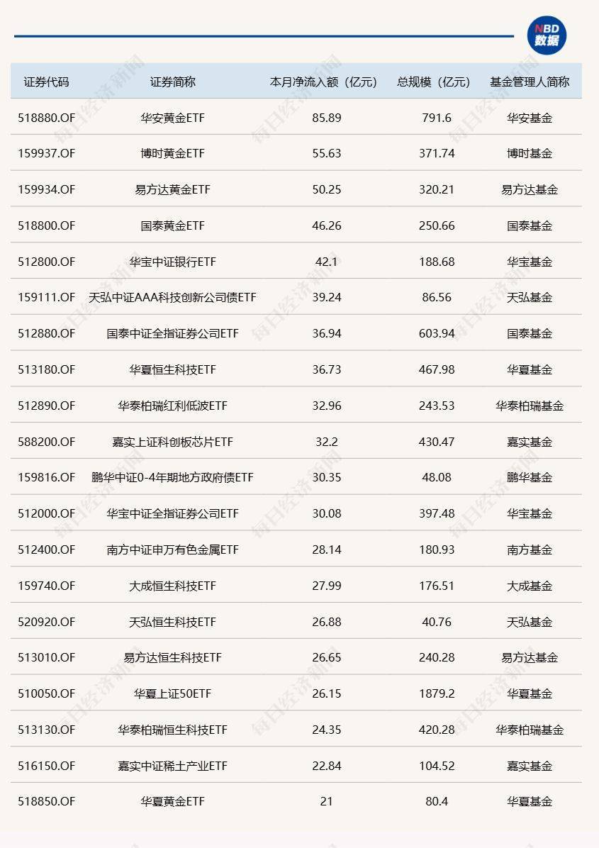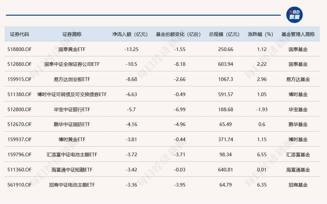 与此同时,国泰黄金ETF基金份额减少1.55亿份,净流出额为13.25亿元;国泰中证全指证券公司ETF基金份额减少8.18亿份,净流出额为10.50亿元;易方达创业板ETF基金份额减少2.66亿份,净流出额为8.68亿元。