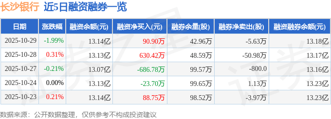 长沙银行融资融券信息显示,融资方面,当日融资买入1860.34万元,融资偿还1769.44万元,融资净买入90.9万元。融券方面,融券卖出300.0股,融券偿还5.66万股,融券余量42.96万股,融券余额402.54万元。融资融券余额13.18亿元。