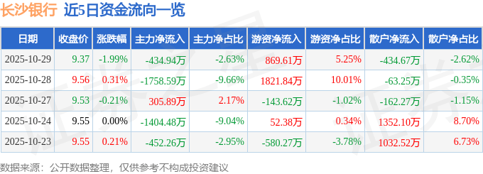 证券之星消息,截至2025年10月29日收盘,长沙银行(601577)报收于9.37元,下跌1.99%,换手率0.44%,成交量17.6万手,成交额1.66亿元。