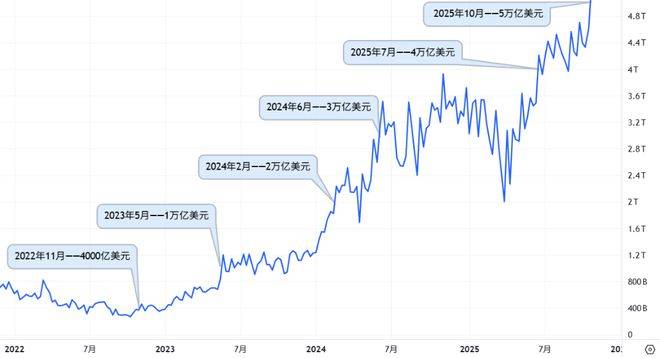 2022年11月——4000亿美元2023年5月——1万亿美元;2024年2月——2万亿美元;2024年6月——3万亿美元;2025年7月——4万亿美元;2025年10月——5万亿美元。