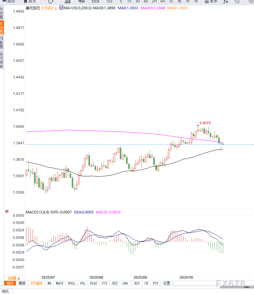 从日线来看,美元/加元在1.3890—1.3950区间呈现震荡整理格局。价格位于200日均线略下方,短期均线呈下行排列,MACD柱体收窄且位于零轴附近,显示空头动能减弱