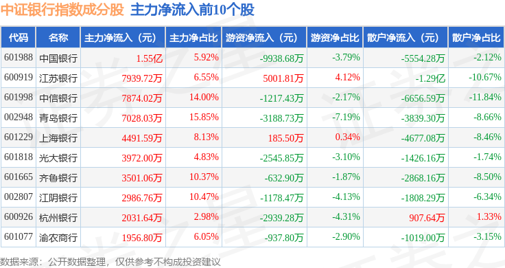资金流向方面,中证银行(399986)指数成份股当日主力资金净流出合计12.71亿元,游资资金净流入合计5.02亿元,散户资金净流入合计7.68亿元。成份股资金流向详情见下表: