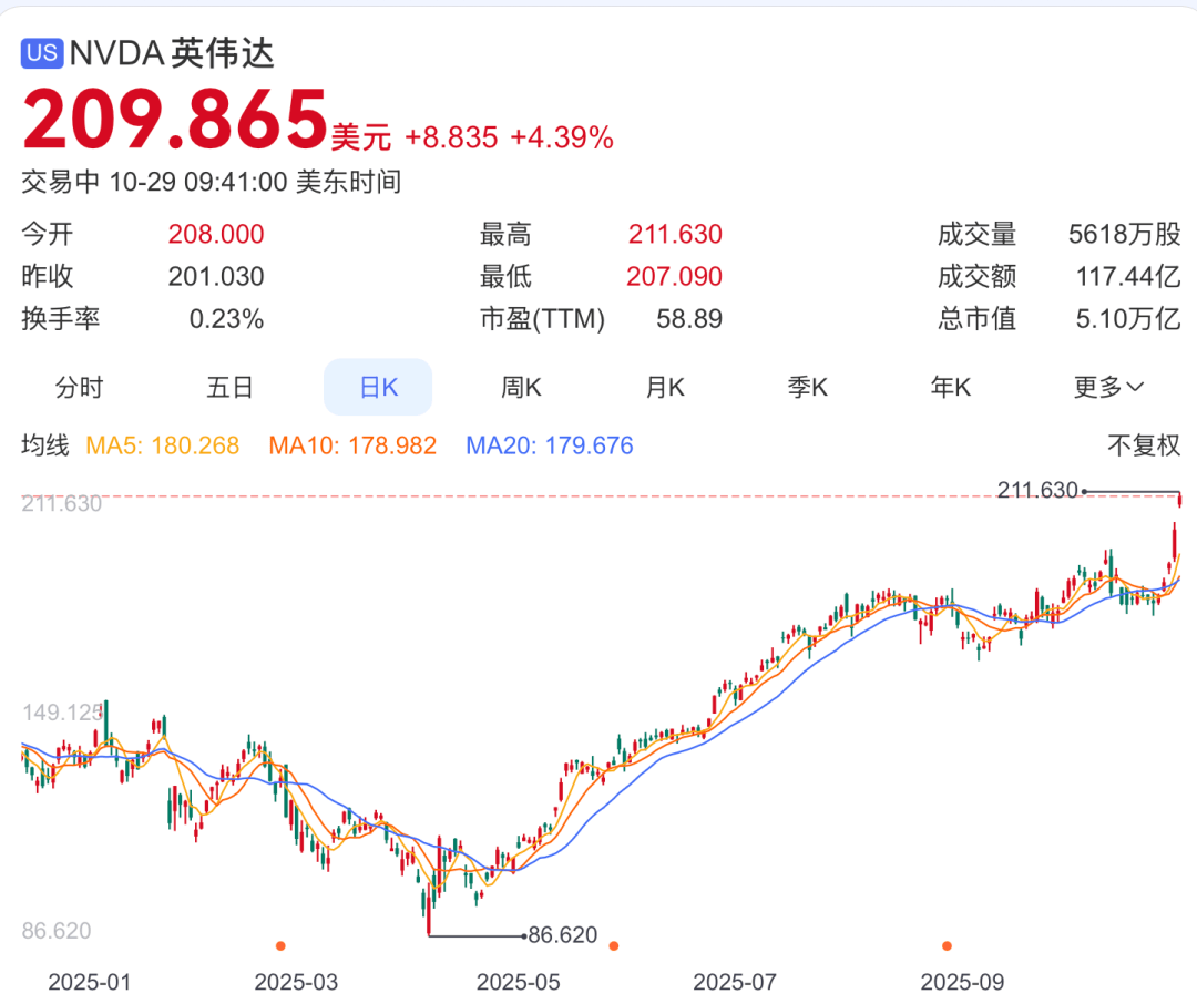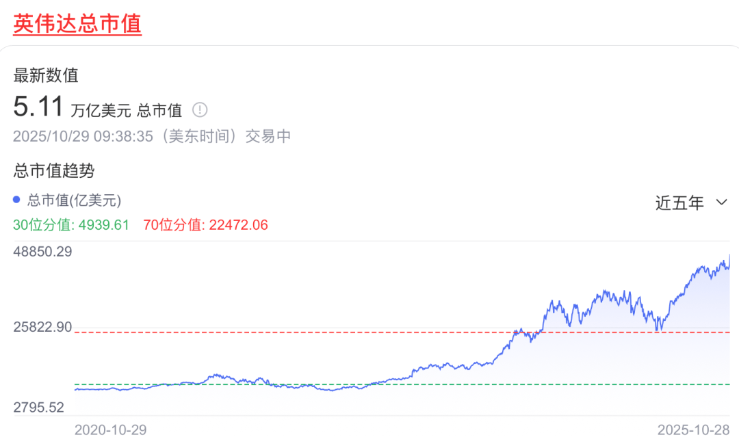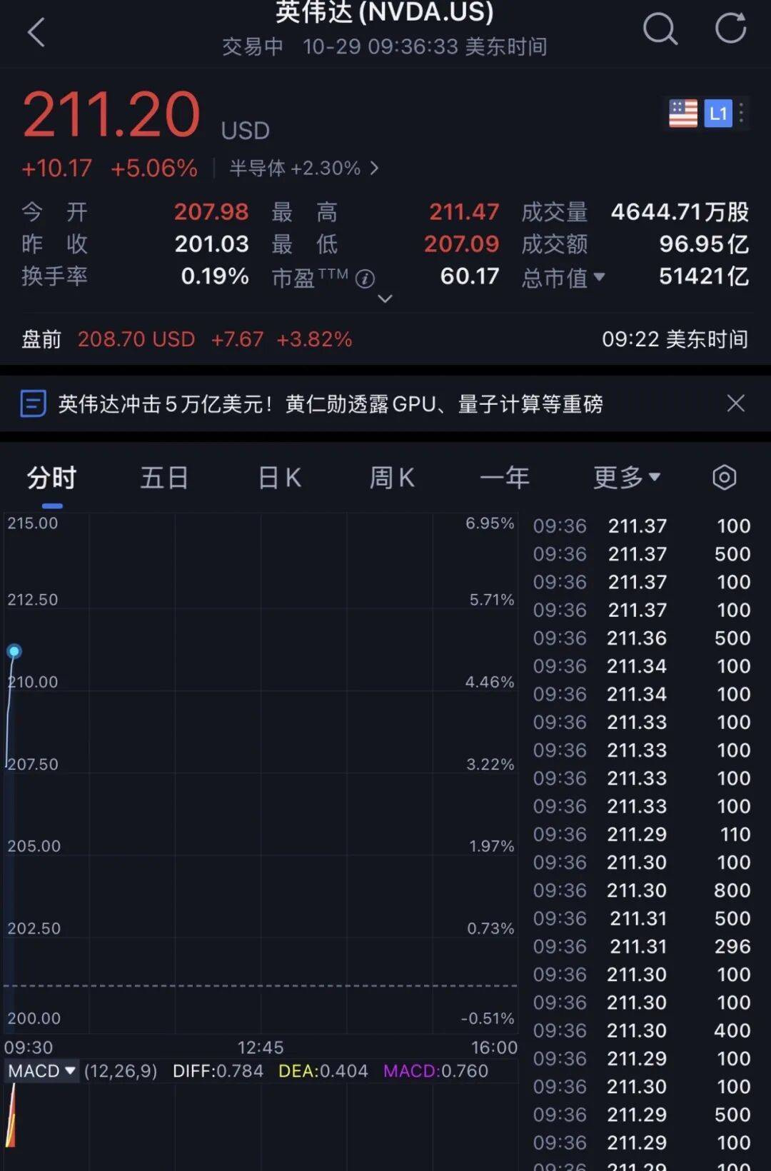 芯东西10月29日报道,刚刚,英伟达市值正式突破5万亿美元大关!这标志全球股市的新里程碑——我们见证了史上第一家5万亿美元上市公司的诞生。