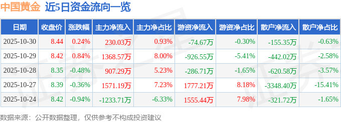 证券之星消息,截至2025年10月30日收盘,中国黄金(600916)报收于8.44元,上涨0.24%,换手率1.74%,成交量29.2万手,成交额2.46亿元。