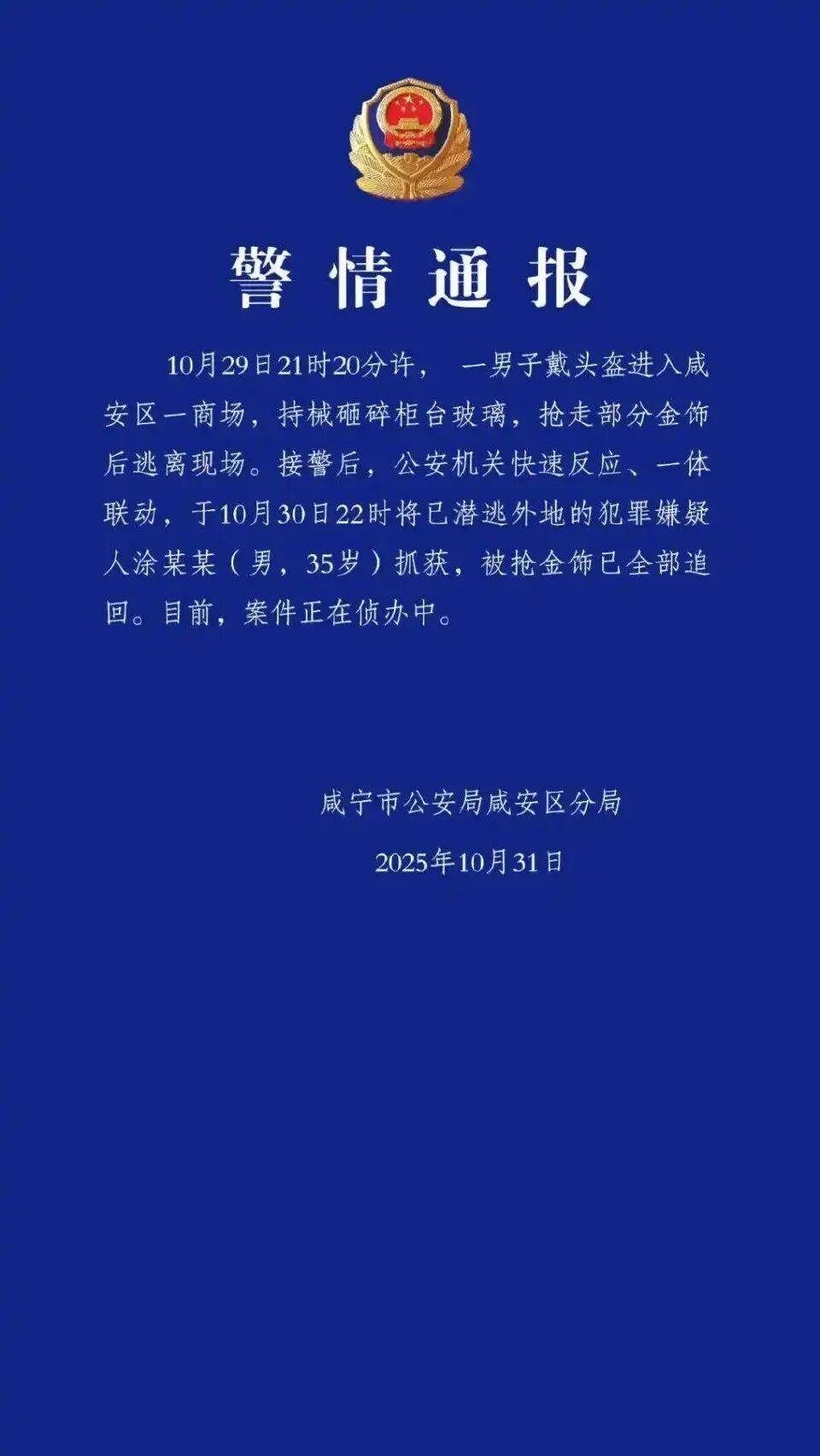 10月31日,湖北咸宁市公安局咸安区分局发布警情通报:10月29日21时20分许,一男子戴头盔进入咸安区一商场,持械砸碎柜台玻璃,抢走部分金饰后逃离现场。