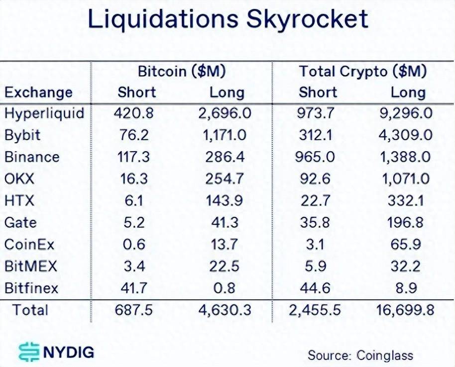 下表展示了被强制平仓的规模(交易所 API 将此类交易标记为「强平」):空头在反弹中被强平 25 亿美元,多头被强平 167 亿美元,总计 192 亿美元的交易者损失,遍布所有加密资产。就比特币而言,空头被强平 6.9 亿美元,多头被强平 46 亿美元,导致比特币交易者财富蒸发 53 亿美元。Hyperliquid 的强平损失遥遥领先,交易者净资产蒸发超过 100 亿美元,进而引发 Binance 和 Hyperliquid 创始人隔空交锋,争执哪家平台的数据更准确。