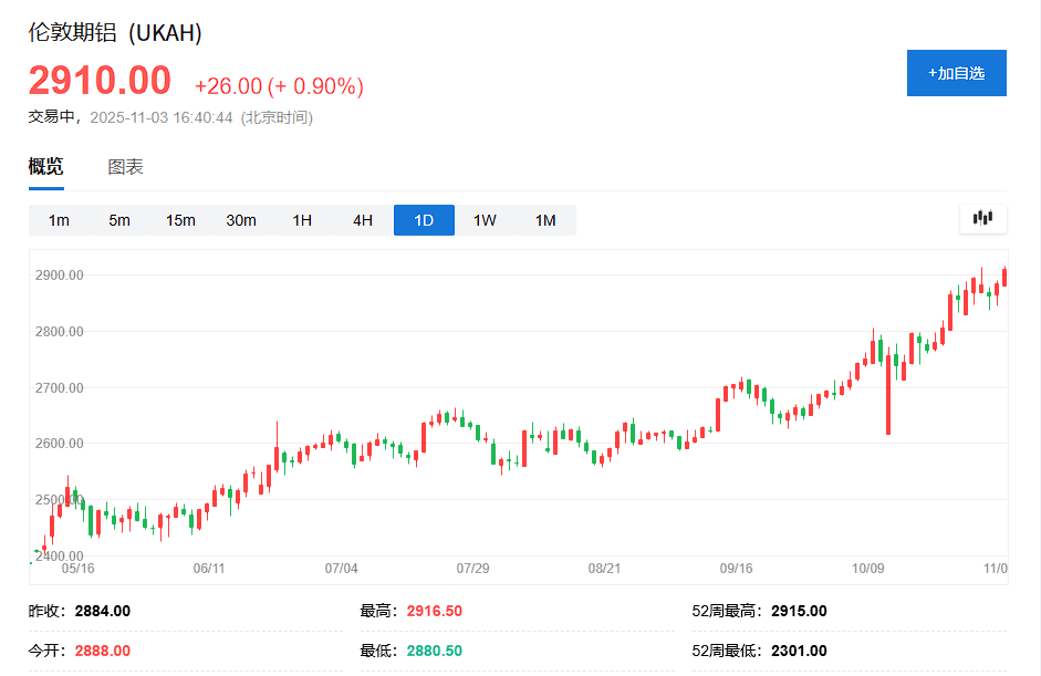 基本金属市场跟随其他风险资产走强,铝价势将创下自2022年5月以来的最高收盘价。伦敦金属交易所铝价上涨0.9%,至每吨2,909.50美元。铝价在10月份上涨超过7%,创出一年多来最佳表现。