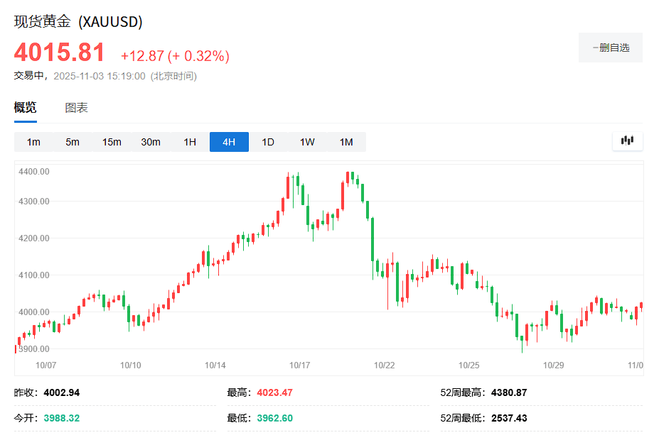 黄金在亚市早盘一度跌至3960美元,随后拉升收复4000美元关口,目前接近4020美元,投资者关注全球最大黄金消费市之一的中国结束税收优惠政策,给市场带来的影响。